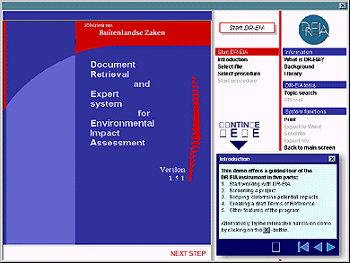 DR-EIA compares project data with relevant rules, regulations and procedures for Environmental Impact Assessment (EIA) to determine whether or not a formal EIA is required (screening). It uses expert knowledge to identify prospective bio-physical and socio-economic impacts of project activities (scoping). Finally, it facilitates formulation of a Terms of Reference for an EIA report.