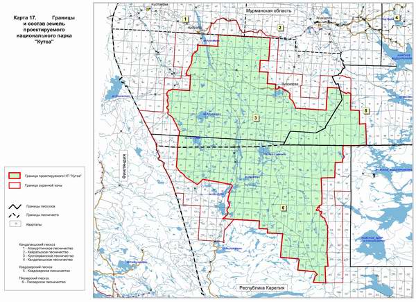 | Начало | "Кутса" | "Терский берег"| "Хибины" | "Лапландский лес" | Карта 17. Границы и состав земель проектируемого национального парка "Кутса" |