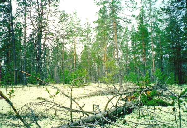 Рис. 12. Сосняк лишайниковый с крупными ветровальными окнами в долине р. Яурийоки Согласно радиоуглеродной датировке палинологических материалов колонки донных отложений из оз. Акуваара в Финской Лапландии, северотаежные сосновые леса сформировались на рассматриваемой территории в начале атлантического периода около 8 тысяч лет назад (Hyvarinen, 1975). По мнению Г.А. Елиной и Р.М. Лебедевой (1982), эти сосновые леса "можно определенно расценивать как устойчиво коренные". Длительное устойчивое существование столь крупных массивов сосновых лесов поддерживалось серией пожаров, повторявшихся приблизительно раз в столетие, что, очевидно, связано с широким распространением на этих территориях песчаных водно-ледниковых отложений. При этом хороший дренаж и наличие большого количества горючего материала (ягель и др.) приводят к выгоранию подстилки на огромных площадях. О частоте пожаров можно судить по огневым рубцам на деревьях, а также по возрастному спектру соснового древостоя. В некоторых местах наиболее старые сосны несут следы 3-5 пожаров. В действительности в течение одного жизненного цикла пожары могли происходить еще чаще, но слабые низовые палы практически не оставляют следов на толстой коре. Последний крупный пожар, судя по возрасту соснового подроста, произошел несколько десятков лет назад. Этот и как минимум один предыдущий пожары не распространялись восточнее реки Вокман, благодаря чему по этой реке в настоящее время проходит граница между сосняками и ельниками. Как уже отмечалось при характеристике растительного покрова территории, в сосновых массивах доминируют лишайниково-кустарничковые либо кустарничково-лишайниковые сосняки (рис. 13).