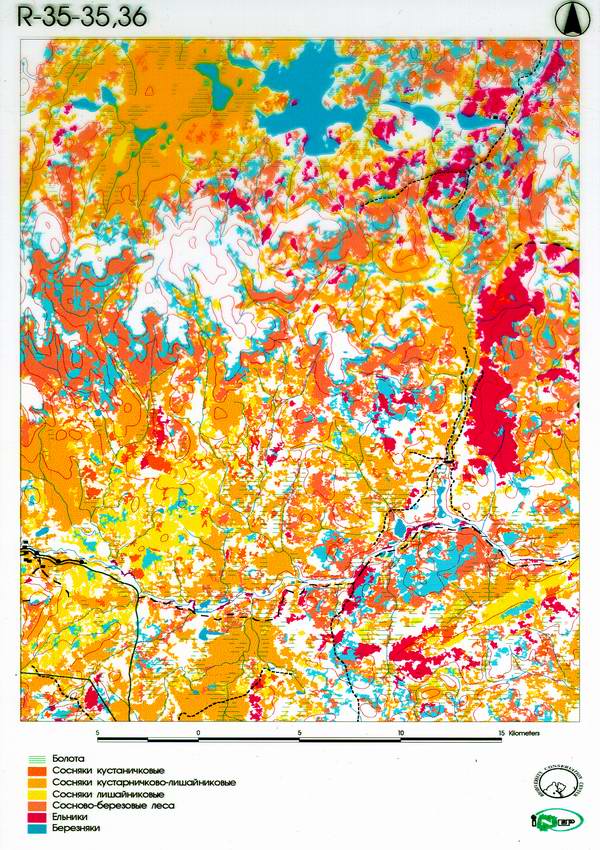 В соответствии с упомянутыми подходами, "коренным" является лес, структурно-динамическая организация которого позволяет ему быть устойчивым в течении бесконечно длительного времени и которая поддерживается за счет естественных процессов (случайных нарушений, связанных с популяционной жизнью древесных пород, воздействием насекомых-фитофагов, болезней или воздействием пожаров). При этом коренной лес может существовать только на участке, площадь которого обеспечивают равновесный характер динамики случайных нарушений, поддерживающих смену древесного яруса (Ярошенко, 1999) . Таким образом, возраст древостоя не является ведущим критерием отнесения леса к "коренному" и выделение коренных лесов требует наряду с использованием материалов лесоустройства дополнительных специальных обследований. Предварительное выделение лесных массивов естественных малонарушенных лесов на рассматриваемой территории осуществлялось с использованием топографических карт местности масштаба 1:1000000 и крупнее, материалов лесоустройства, космических многозональных снимков высокого разрешения ИСЗ "Ресурс-03" и "SPOT-3" за 1997-1998 гг. (Карта 4). Выделенные на данном этапе лесные массивы, включающие лесные и нелесные экосистемы с долей лесных не менее 50%, отвечали основным требованиям проекта стандарта "Порядок выявления потенциальных массивов естественных малонарушенных лесов":