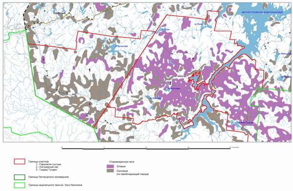 | Начало | "Кутса" | "Терский берег"| "Хибины" | "Лапландский лес" | Карта 8. Старовозрастные леса в районе предлагаемых к охране территорий |