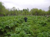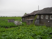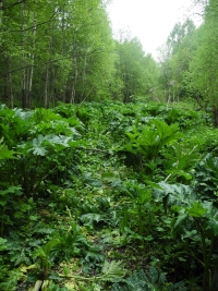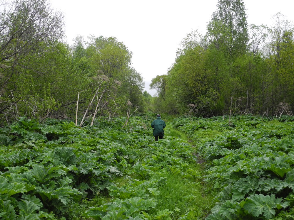 Таксист, который вез нас в Мосеево, удивлялся, зачем нам туда надо, «это же рассадник борщевика и больше ничего». Сам он уже пострадал от ожогов этого растения, хорошо – несильно. Борщевик тут вышел из-под контроля, и это заметно на значительном расстоянии от деревни. Вообще в Вологодской области вдоль дорог борщевик нам не встречался (мы ездили по Тотемскому и Нюксенскому районам), еще один, но небольшой, «оазис» из борщевика видели возле коровника в другой деревне. Здесь же борщевик появляется вдоль трассы за несколько километров до Мосеево, потом к деревне ведет дорога через заброшенное поле, уже капитально заросшее этим интродуцентом. Коровники и многие дома в деревне окружены борщевиком. Он в палисадниках (две женщины при нас вяло косили его косами). Он в поле по пути к лесу. Он в лесу – и под деревьями, и прямо на дороге. Примерно с километр идешь по лесной дороге – давишь массивные стебли, немного жутковато. Это сейчас борщевик еще несильно вырос, через месяц в этот лес уже не сунешься без машины с закрытыми окнами – а через лес люди добираются на клюквенное болото, и оно все изуродовано колеями.