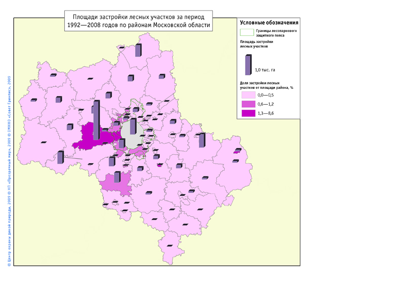 Площади застройки лесных участков за период 1992—2008 годов по районам Московской области |