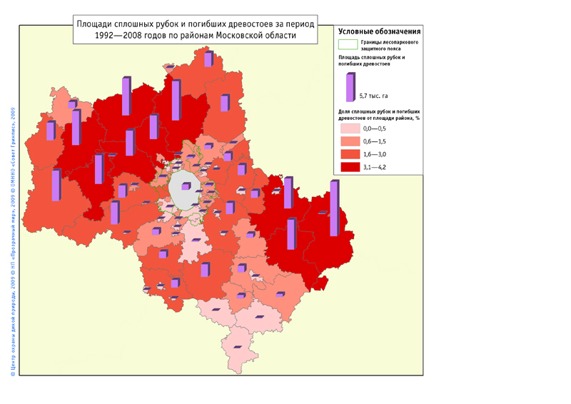 Площади сплошных рубок и погибших древостоев за период 1992—2008 годов по районам Московской области |