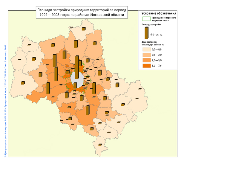 Площади застройки природных территорий за период 1992—2008 годов по районам Московской области |