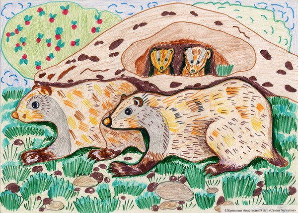 "Семья барсуков". Настя Криволап, 9 лет, заповедник "Комсомольский"