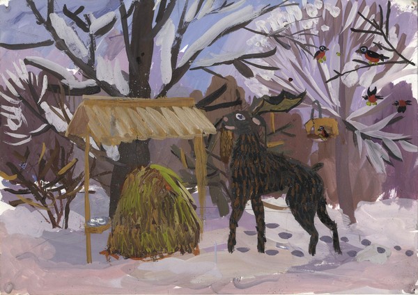 «Лось у кормушки». Полина Романова, 9 лет, г. Смоленск. Национальный парк «Смоленское Поозерье»