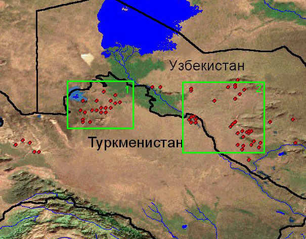 Для получения информации о месте регистрации тушканчика Бобринского нажмите на точки.