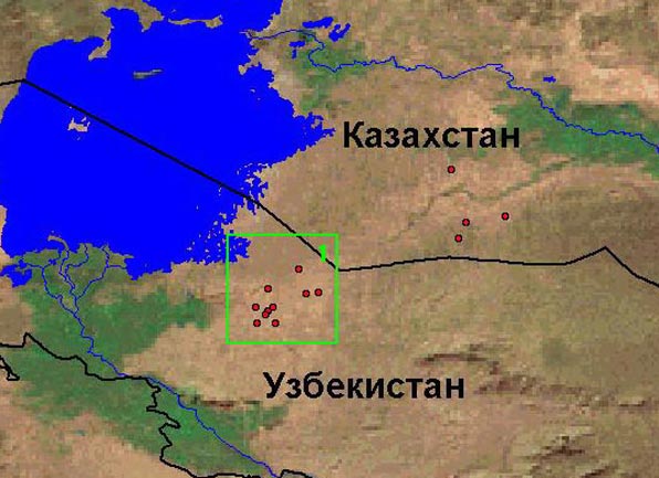 Для получения информации о месте регистрации карликового тушканчика Гептнера нажмите на точки или выделенные районы.