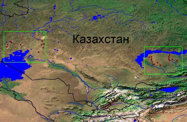 Для получения информации о месте регистрации бледного карликового тушканчика нажмите на выделенные районы.
