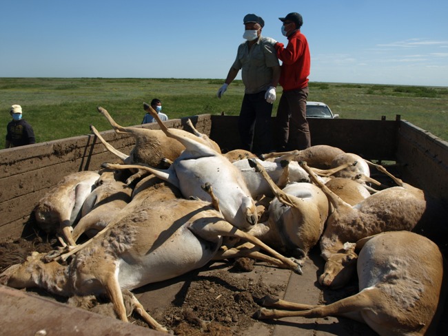 26 мая 2010 г. Виновных в гибели сайги не будет? Количество погибшей в Западно-Казахстанской области сайги увеличивается каждый день. Сегодня на пресс-конференции директор областного департамента санэпиднадзора Серикбай Иманкул сообщил журналистам, что число собранных туш достигло уже 12 тысяч – это почти половина всей уральской популяции По информации санэпидемиологов, сбор и поиск трупов животных в радиусе уже 45 километров продолжается. В утилизации туш животных задействовано около 100 человек. Серикбай Иманкул, назвав мор сайги происшествием республиканского масштаба, опроверг версию о радиоактивном заражении животных, которую выдвигают местные жители, говоря о деятельности российского военного полигона «Капустин Яр». - Мы провели все радиологические и химические исследования, — заверил журналистов директор департамента. — Все результаты отрицательные, только бактериологический анализ показал чистую культуру пастереллеза.