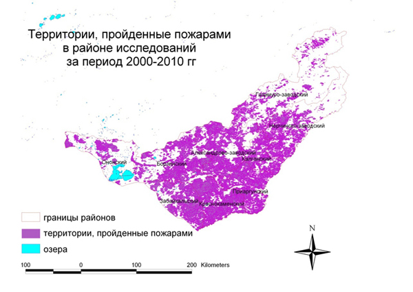 Рис. 3. Площади пожаров в 2000-2010 гг. Районы существенно различаются по площади пожаров (рис. 4 и 5). Наибольшие площади пожаров наблюдались за истекшее десятилетие в Борзинском, Забайкальском, Александрово-Заводском, Краснокаменском, Приаргунском районах. Пожарами сельхозугодья пройдено в этих районах за десятилетия по 2-3 и более раза. В большинстве случаев площади пожаров положительно коррелируют с плотностью населения (рис.6). Исключение составляют Александрово-Заводский и Ононский районы.