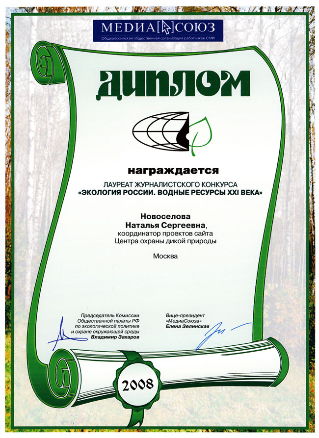 В числе прочих конкурсантов, диплом лауреата этого конкурса получил координатор проекта Центра охраны дикой природы «Сохраним русскую выхухоль» Новоселова Наталья. На конкурс (по номинации «Интернет») была подана страница сайта ЦОДП, посвященная эколого-просветительской акции «Защитим хохулю вместе».