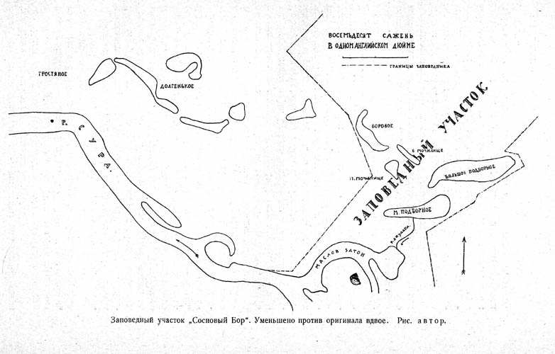 Таким образом, согласно этим данным, число жилых нор составляет лишь 12% общего числа. Теперь, когда я имею несколько больший опыт наблюдения, мне думается, что моя таблица не совсем верна. В самом деле, метод, которым я пользовался для установления, жилая ли данная нора или нет, не лишен недостатков. Как говорилось в предыдущей статье, жилая нора имеет более или менее выраженный запах мускуса в подходной траншее. Этот признак мне в 1925 году известен не был и стало быть возможно, что часть нор, которые я считал жилыми, в действительности жилыми не были. Это однако не все. Нужно еще иметь в виду, что выхухоль делает так называемые кормовые норы, временного характера. В одной такой кормовой норе, виденной мною в июне 1927 года и имевшей один ход, затем вильчато разветвленный, я нашел кусочки каких то корешков, которые можно было бы считать за обглоданные выхухолью, если бы это можно было бы, вместе с тем, прочно установить... Следовательно, одна и та же особь или же семья, могут иметь не одну, а несколько нор - одну жилую и кормовые. Возможно, часть нор, которые я считал нежилыми, в действительности были норами кормовыми. Это конечно заставляет относиться к произведенному мною учету осторожно, но вместе с тем легко видеть, что допущенные мною в 1925 году неточности имеют взаимно противоположное направление и влияние на конечный подсчет, а следовательно допустимо думать, что я, в конечном итоге, не слишком ошибся: число жилых нор все же невелико. Кроме того, не трудно заметить, что в районе Бессоновки выхухоли меньше чем в районе Грабово (см. табл. 1). Это и понятно: в первом районе выхухоль, повидимому, более истребляется, так как в Бессоновке кажется не мало профессионалов хохулятников; называли мне и скупщика. Необходимо, имея более или менее точные критерии жилой норы, которые можно все-таки считать в настоящее время выясненными, подойти более точно к учету количеств выхухоли в данном районе. Эту работу, как мне кажется, должны взять на себя местные исследователи. Что касается вопросов согласования охраны выхухоли с интересами населения, то по этому поводу я уже высказался в печати (1927) и здесь лишь напомню, что весьма целесообразно, на мой взгляд, подумать о некоторых формах осторожной эксплоатации выхухоли там, где это возможно организовать и где иные формы охраны недействительны. Возможно, что это удастся осуществить в виде заказников, принадлежащих крестьянам, организованным в общество. Кроме того, необходимы конечно и заповедники. В некоторых случаях они самостоятельны; в иных - связаны с промышленными заказниками. Повторяю, здесь я об этом говорить не намерен, и позволю себе рассмотреть лишь некоторые данные о заповедных бассейнах. Вопрос об организации заповедных бассейнов выхухоли был поднят в Пензе в 1925 году. Я высказался об этом в Пензе, где к этому вопросу с живейшим участием отнесся директор Пензенских Заповедников; проф. И. И. Спрыгин, а равно и в Москве, в заседании Гос. Ком. по Охране Природы, при чем названный Комитет постановил следующее: "Продолжение экспедиционного обследования мест обитания выхухоли и выяснение границ намечаемого заповедного участка в Пензенской губ. считать очередной работой в будущем году (летний сезон 1926 г.) (Из протокола № 40 от 4/XI-1925 года". Разрядка моя). В 1926 году я, в виду сказанного, осматривая поймовые озера, и