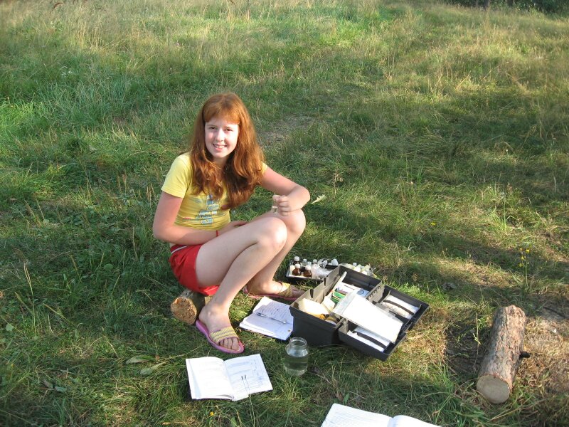 В17 часов началась защита кафедр. Несмотря на многочисленные развлекательные мероприятия во время лагерной смены большинство ребят много узнали о природных объектах и приобрели исследовательские навыки. Все это они успешно продемонстрировали во время творческих отчетов. В 23.00 началась игра «Сокровища Плещея». Под звуки Сказания о земле Переславской команды по очереди уходили в ночной лес за сокровищами Плещея. Духи, оборотни и ведьмы охраняли эти сокровища. Наша команда, немножко покричав от страха, но, крепко держа друг друга за руки, преодолела препятствия и нашла все сокровища: почитание Родины, уважение к близким и любовь к самому себе... День 8-ой. Заключительная линейка последнего дня была немного грустной. Наши выпускники Дима Петров и Саша Абдуллоев понимали, что для них этот лагерь - последний, дальше начнется совсем другая студенческая жизнь. Впервые приехавшие в лагерь Саша Мочалов, Руслан Маслов, Дима Базурин, Аня Казакова, Эля Карцева, Настя Балуева, Маша Курочкина, Аня Михайловская переживали, что за короткую лагерную смену не все успели узнать, увидеть, не со всеми познакомились... С сентября начнем готовиться к новому лагерю «Мы - дети Волги», который, очень надеемся, состоится в будущем году, и мы обязательно примем участие в его работе. ГОЛУБОЙ ПАТРУЛЬ В конце августа ребята из клуба «Экосистема» (НСШ) совершили традиционный односуточный байдарочный поход вверх по Солонице. Как рассказали нам самые младшие участницы «патрульной» команды - семиклассницы Эля Карцева и Настя Балуева; и ученица восьмого класса Аня Михайлоская, главной целью похода было проведение научно исследоватн экспериментов и сбор материалов для научных работ по биологии и экологии Солоницы. Вектор движения - вверх по течению по направлению к санаторию Строитель, состав экспедиции - 9 участников (включая руководителей). Неопытных новичков посадили в пару к байдарочникам, со стажем, и все равно, признались девочки, идти против течения было нелегко. На протяжении пути юные экологи считали ряску и по специальной методике определяли, какая вода в Солонице (по предварительным подсчетам, умеренно-загрязненная). Еще измеряли глубину и прозрачность реки, чтобы впоследствии провести сравнительный анализ с аналогичными данными 2004 года. С речного дна брали организмы для изучения - дафнии, ракушки, улитки, пиявки и проч. - и рассматривали их через увеличительное стекло. Делали химический анализ воды с помощью специальных реактивов, фиксировали запах (илистый, болотный) и цвет (бледно-желтый). Конечной точкой путешествия стала деревня Медведки выше санатория Строитель. Там исследователи разбили палаточный лагерь и походную кухню. Погода благоприятствовала путешественникам, и лишь комары и муравьи внесли маленькую «ложку дегтя» в речную эпопею наших героев.