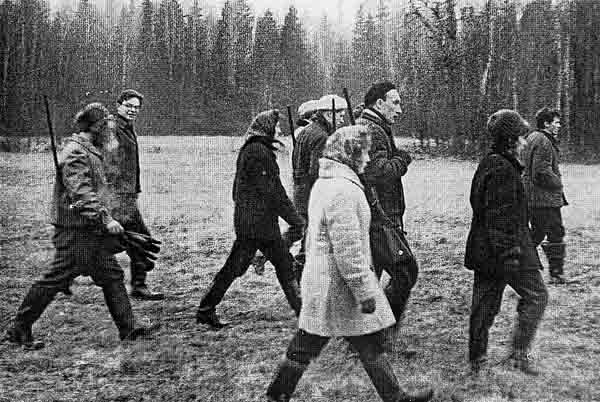 Дружина по охране природы биологического факультета МГУ в рейде по борьбе с браконьерством. Третий справа - профессор Вадим Николаевич Тихомиров, один из бессменных кураторов Дружины. Московская обл., начало 1960-х годов.
