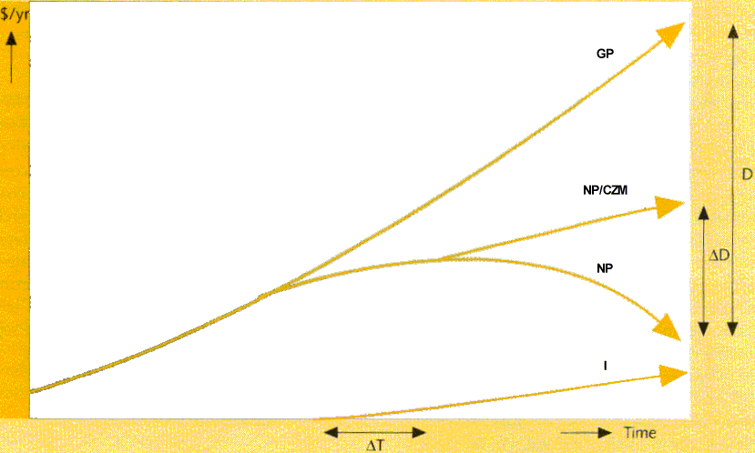 | The upper line (GP), which represents total gross production in a particular area, country or region, increases as a result of population growth, technical progress and economic development. However, the damage (D) also increases due to accelerated sea level rise, pollution, congestion, over-exploitation of resources, etc. If no coastal zone management measures are taken, the increase in damage will be higher than the increase in total gross production, resulting in reduced net production (NP), eventually leading to a collapse. Reduction of damage (deltaD) can be achieved by pro-active investments in coastal zone management (I). Due to the long lead times required for the measures to have effect, it will take some time before an actual reduction in damage is realized. This time lag is indicated by deltaT. During this period, no benefits will arise from the investments. Later, however, the reduction in damage enables net production (NP/CZM) to continue to increase, which can be regarded as sustainable development. (source IPCC93) | ![]() |