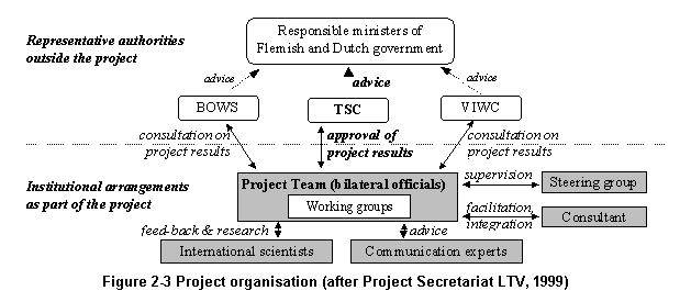 An example of an organisation structure for an ICZM process is the structure used in the project "Sustainable development of the Scheldt Estuary: Building an integral long-term vision for the Scheldt Estuary".