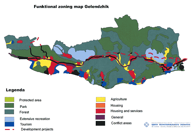 Условные обозначения (сверху вниз, слева направо):охраняемая территория, парк, лес, зона отдыха, туризм, проекты застройки, сельское хозяйство, жильё, жильё и службы, общее, области конфликтов.