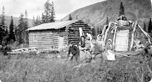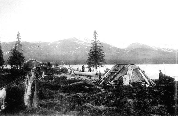 Рис. 19. Летняя стоянка ловозерских саамов у северо-восточных отрогов Ловозерских тундр. 1926 год. Фото из альбома Б.М. Куплетского Об Екостровском погосте, территория которого распространяется и на Хибинские тундры, в писцовой книге говорится, что его угодьями были Мунозеро с речкой, Чунаозеро, Вочеламбина и другие губы и заливы озера Имандра (рис. 20). "А ловят они в тех речках и по озерам и по губам белую рыбу про свою нужду, да в лесу зверя бьют и птицу ловят, тем себя и кормят" (Харузин, 1890). В писцовой книге практически не упомянуты олени и выпасные угодья, а только рыболовецкие промысловые озера и пушнина.