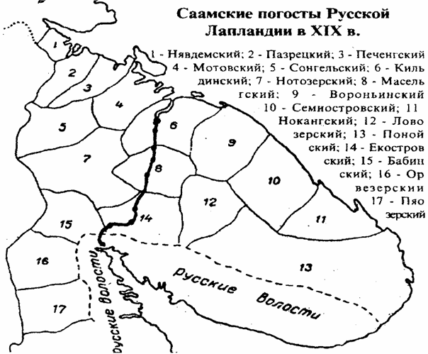 | Начало | "Кутса" | "Терский берег"| "Хибины" | "Лапландский лес" | 3. СОЦИАЛЬНО-ЭКОНОМИЧЕСКАЯ ХАРАКТЕРИСТИКА РЕГИОНА3.2. Особенности природопользования и управления природными ресурсами в районе проживания коренного населения3.2.1. Ранняя история природопользованияПрисваивающее хозяйство. Территория Кольского полуострова была заселена человеком еще в глубокой древности. Первые следы жизнедеятельности человеческих коллективов на Кольском полуострове датируются концом VIII т.л. до н.э. и типологически относятся к мезолиту. По данным археологии заселение проходило со стороны северо-запада. Позднее в VII-VI тыс. до н.э. происходит расселение населения на юго-восток и юго-запад. К концу V тыс. до н.э. осваивается практически весь регион. Археологические памятники Кольского полуострова эпохи неолита (начало IV- конец III т.л. до н.э.) составляют кольский локальный вариант лапландской археологической культуры, объединяющей одновременные объекты на территории Северной Фенноскандии и современной Мурманской области. Анализ хозяйственной деятельности древнего человека на Кольском полуострове показывает, что все изменения, происходившие в его среде от начала мезолита, до эпохи раннего металла, подчинены задаче наиболее полного приспособления к природным условиям. Первые переселенцы были охотниками. Последовательные изменение климата позволили им достичь высокого уровня культуры в морском и зверобойном промысле. На рубеже II - I т.л. до н.э. на территории Северо-Восточной Европы с Урала и из Западной Сибири расселились фино-угорские племена, которые смешивались с местным населением. В I тыс. до н.э. в природной среде Северной Европы произошли значительные изменения, приведшие к исчезновению поселений морских охотников. Уцелевшие остатки некогда многочисленных оседлых сообществ стали дробиться и переходить к подвижной охоте в лесных и горных районах. Природные условия Кольского полуострова чрезвычайно благоприятствовали развитию рыболовства и морского промысла. Археологические раскопки в разных частях региона, и в том числе в районе озера Ловозера донесли до нас множество предметов, связанных с этим видом хозяйственной деятельности древнего человека. Уже самые первые письменные источники, упоминающие ловозерских саамов (XVI в.) упоминают об использовании ими Сейдозера как рыбного угодья. В писцовой книге Кольского уезда, составленной в 1608-1611 годах, сказано, что Ловозерский погост "... владеет… тремя озерами Ловозером, Сейдозером и Си озером и половиной речки Рынды. Для своей нужды ловят они в озерах белую рыбу …" (рис. 19).