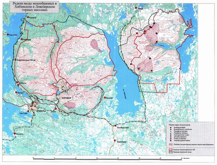 | Начало | "Кутса" | "Терский берег"| "Хибины" | "Лапландский лес" | Карта 6. Редкие виды мохообразных в Хибинском и Ловозерском горных массивах |