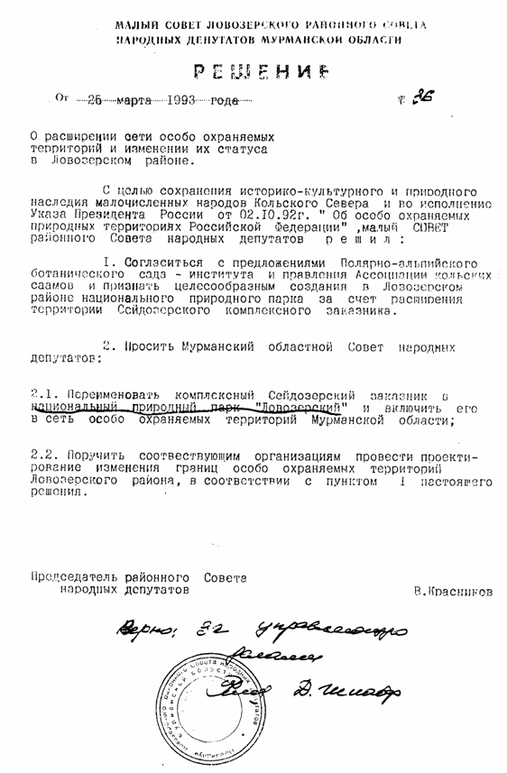 | Начало | "Кутса" | "Терский берег"| "Хибины" | "Лапландский лес" | Приложение 1. Решение №36 от 25.03.93 г. Ловозерского районного совета народных депутатов "О расширении сети особо охраняемых территорий и изменении их статуса в Ловозерском районе"