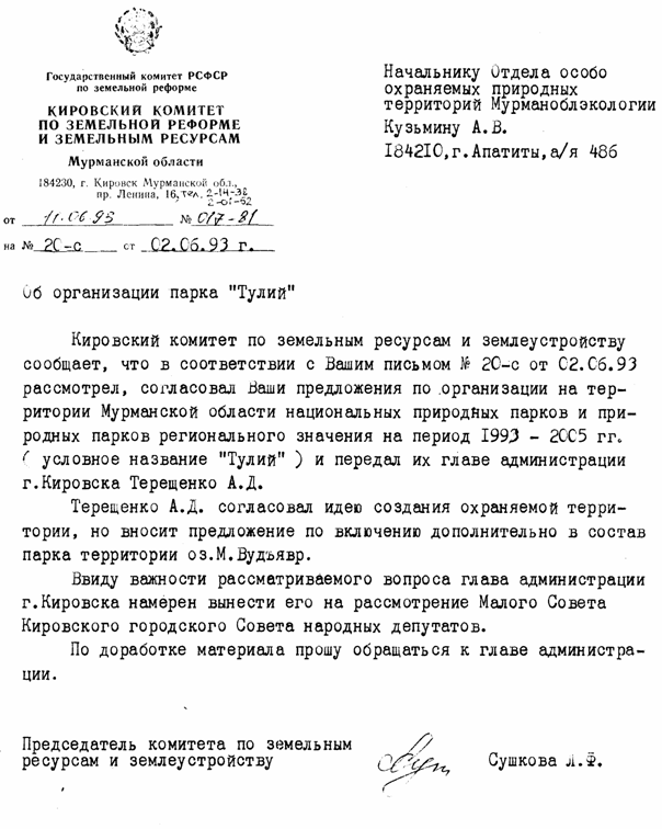 | Начало | "Кутса" | "Терский берег"| "Хибины" | "Лапландский лес" | Приложение 2. Письмо от 11.06.93 г. Кировского комитета по земельной реформе и земельным ресурсам "Об организации парка "Тулий"