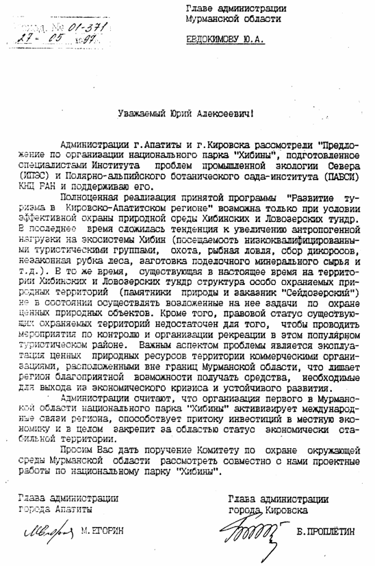 | Начало | "Кутса" | "Терский берег"| "Хибины" | "Лапландский лес" | Приложение 5. Письмо №01-371 от 27.05.97 г. Глав администраций г.г. Апатиты и Кировска