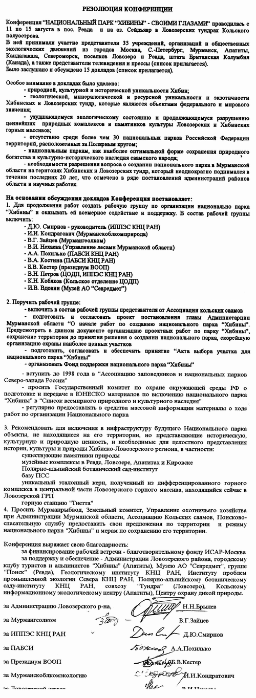 | Начало | "Кутса" | "Терский берег"| "Хибины" | "Лапландский лес" | Приложение 7. Резолюция конференции "Национальный парк "Хибины" - своими глазами", 11-15.08.97 г.