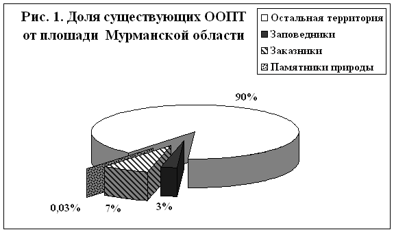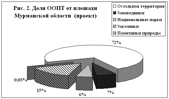 времени сохранились крупные массивы малонарушенных экосистем В Мурманской области, как это не парадоксально звучит, благодаря промышленной ориентации экономики в социалистический период, территория оказалась разделена на интенсивно освоенные, ограниченные по площади промышленные районы, с одной стороны, и крупные слаботрансформированные природные массивы, с другой. По нашим оценкам, площадь лесов, затронутых вырубками составляет около 70% от всей лесной площади полуострова (Карта 1). Меньшую часть из них (около 14%) составляют наиболее разрушительные современные сплошные вырубки, которые велись с 60-х годов с применением тяжелой тракторной техники. Изменения древостоев в результате промышленных выбросов в атмосферу (по которым обычно судят о катастрофическом состоянии природной среды на Кольском полуострове) приобрели массовый характер, но не достигли масштабов изменений лесов в результате вырубок и перевыпаса оленей, наблюдаемых в западной части Баренцева региона. Так, площадь лесов, поврежденных промышленными выбросами металлургических комбинатов "Печенганикель" и "Североникель", составляет всего 2,7% от всей лесной площади, причем доля погибших древостоев составляет только 0,2%. В настоящее время сеть ООПТ в пределах российской части Баренцева региона насчитывает 243 объекта, в том числе 6 заповедников, 61 заказник, 3 национальных парка и 172 памятника природы, что составляет 5,2% материковой части региона. В то же время, как показал анализ (Сохранение природы…, 1997), существующая сеть ООПТ в функциональном отношении не отвечает современным требованиям. Пример Мурманской области хорошо иллюстрирует основную причину этого несоответствия (Карта 2): подавляющее число ООПТ представляют заказники, как правило, существующие лишь формально; они занимают 7,4% от площади области и 75% от общей площади ООПТ (рис. 1). Сеть ключевых, системообразующих объектов - заповедников и национальных парков - практически не развита. Так, в Мурманской области до сих пор нет ни одного национального парка (3 парка в Карелии и Архангельской области), а 77% (!) от общей площади существующих трех заповедников приходится на первый организованный в области Лапландский биосферный заповедник. Серьезные недостатки региональной сети ООПТ на фоне сохраняющейся тенденции быстрого уменьшения площади естественных экосистем в результате промышленных вырубок леса, разведки и добычи полезных ископаемых, интенсивной рекреации, свидетельствуют о необходимости энергичных скоординированных усилий на международном уровне для выявления, защиты и рационального использования природного разнообразия. В уже упоминавшейся работе "Сохранение природы, культурного наследия и