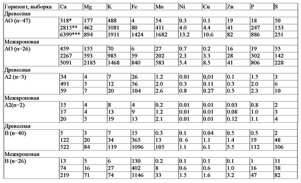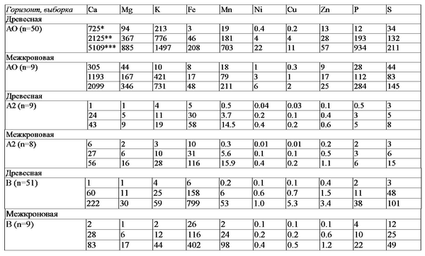 В почвах сосновых лесов также выявляются достоверные парцеллярные и внутрипарцеллярные различия в содержании доступных соединений элементов в органогенных горизонтах почв (табл. 18). В органогенных горизонтах почв древесных парцелл содержание доступных соединений кальция (p=0.0009), магния (p=0.0009), калия (p=0.09), марганца (p=0.038), цинка (p=0.054), железа (p=0.07), никеля (p=0.024), фосфора (p=0.0009) и серы (p=0.10) достоверно выше, чем в почвах парцелл межкроновых пространств. Это, вероятно, связано, с различиями в составе опада и с дополнительным поступлением элементов в почвы древесных парцелл со стволовыми и кроновыми водами. Особенно высокое содержание кальция наблюдается в органогенных горизонтах почв приствольных зон. Минимальные содержания доступных соединений элементов питания наблюдаются в почвах межкроновых пространств, что связано с низкозольностью лишайников, доминирующих в растительном покрове. Минеральные горизонты почв древесных парцелл сосновых лесов богаче почв межкроновых парцелл магнием (p=0.049), калием (p=0.083), цинком (p=0.06). Сходные тенденции отмечаются и для кальция. Вероятно, эти различия, с одной стороны, связаны с поступлением элементов из верхних органогенных горизонтов, с другой - с более интенсивным выветриванием минералов в почвах под деревьями.