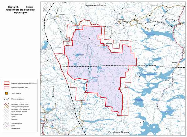 | Начало | "Кутса" | "Терский берег"| "Хибины" | "Лапландский лес" | Карта 13. Схема транспортного освоения территории |