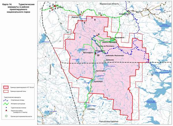 | Начало | "Кутса" | "Терский берег"| "Хибины" | "Лапландский лес" | Карта 14. Туристические маршруты в районе проектируемого национального парка |
