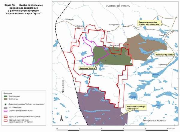 | Начало | "Кутса" | "Терский берег"| "Хибины" | "Лапландский лес" | Карта 15. Особо охраняемые природные территории в районе проектируемого национального парка "Кутса" |