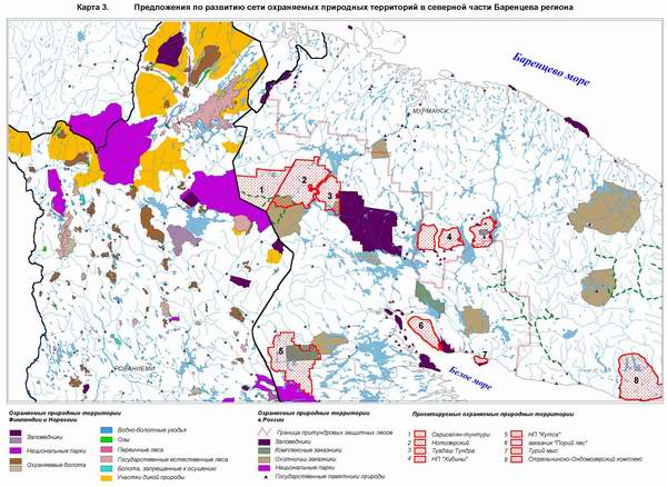 | Начало | "Кутса" | "Терский берег"| "Хибины" | "Лапландский лес" | Карта 3. Предложения по развитию сети охраняемых природных территорий в северной части Баренцева регионе |