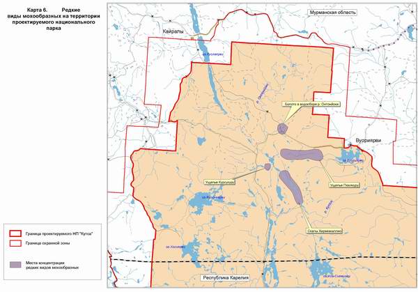 | Начало | "Кутса" | "Терский берег"| "Хибины" | "Лапландский лес" | Карта 6. Редкие виды мохообразных на территории проектируемого национального парка |