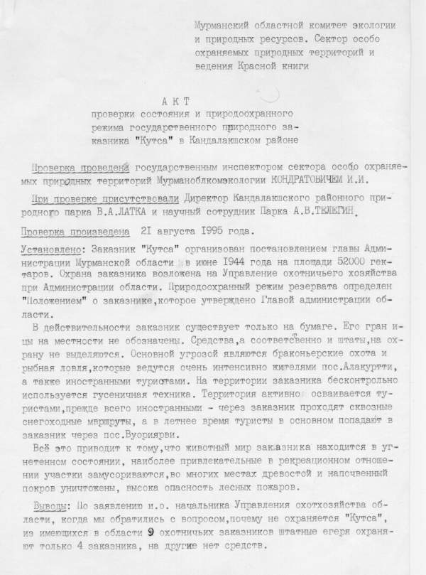 | Начало | "Кутса" | "Терский берег"| "Хибины" | "Лапландский лес" | ПРИЛОЖЕНИЯПриложение 2. Акт проверки заказника "Кутса"