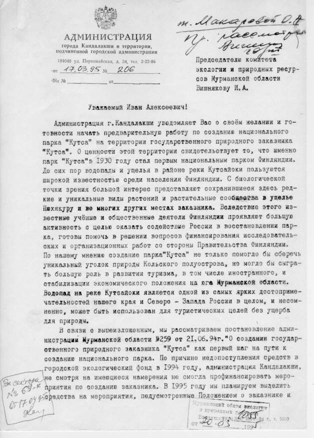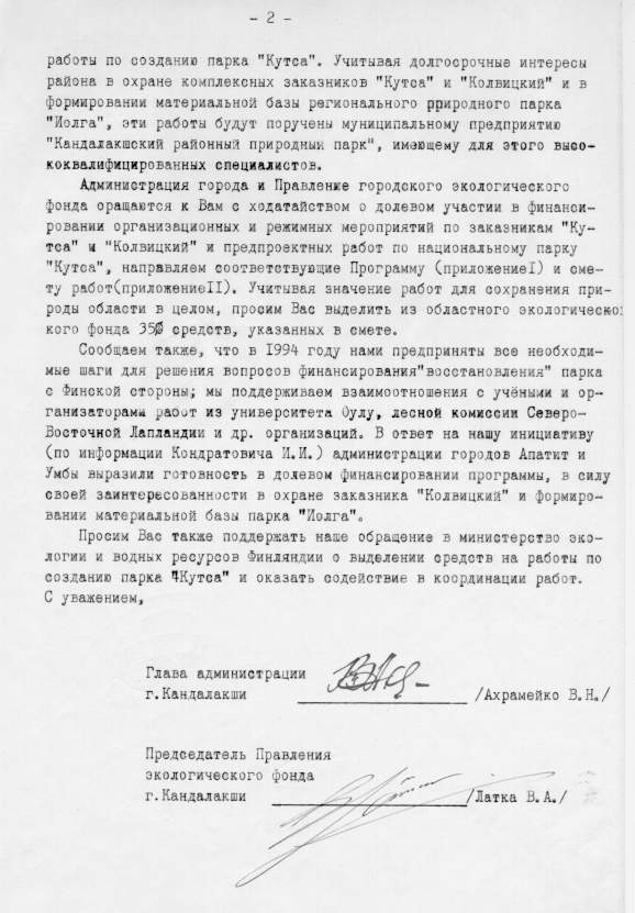 | Начало | "Кутса" | "Терский берег"| "Хибины" | "Лапландский лес" | ПРИЛОЖЕНИЯПриложение 3. Предложение администрации г. Кандалакша об организации национального парка "Кутса"