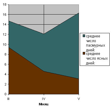 Рис. 3. Среднее число ясных и пасмурных дней по нижней облачности весной Значительное понижение относительной влажности и повышение уровня конденсации не создаёт весной благоприятных условий для выпадения ливневых осадков, несмотря на то, что абсолютное влагосодержание, в связи с ростом температуры, значительно увеличивается. Поэтому основная масса весенних осадков выпадает при обложных дождях, связанных с фронтальной и циклонической деятельностью. Основная масса осадков выпадает весной в виде небольших дождей или снегопадов с количеством осадков не более 5 мм за сутки. Лето. После окончания весенних явлений - схода снежного покрова, вскрытия рек, оттаивания и просыхания почвы, основная масса поступающей солнечной радиации расходуется на прогревание воздуха и на испарение. Поэтому средняя температура воздуха от мая к июню повышается более значительно, чем от апреля к маю. Наиболее существенный средний прирост температуры на ряде станций наблюдается во второй декаде июня (рис. 4).