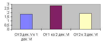 Рис. 4. Повышение температуры от предыдущей к последующей декаде в конце весны и начале лета (град.) Значительные изменения во второй декаде июня испытывают и другие метеорологические элементы. Поэтому за начало лета можно считать вторую декаду июня. Средняя температура лета выше 10°. Самая высокая средняя месячная температура имеет место в июле. В этом месяце она достигает +13, +14°. Самая же низкая средняя температура, от +10 до +9°, наблюдается в июне. Вторжение холодного арктического воздуха вызывает летом значительное похолодание. Мороз возможен в любом из летних месяцев. Вероятность наличия хотя бы одного дня с морозом достигает 70-80% в июне, 15-25% в июле и 25-40% в августе. Минимальная температура понижается до -2, -4° в июле и августе и до -1° в июле. В течение всего сезона заморозки возможны всегда после вторжения холодных масс арктического воздуха. Средняя суточная температура в течение всего лета не опускается ниже 0°. При устойчивой антициклональной и ясной погоде в любом из летних месяцев возможны жаркие дни с температурой > +20 , а может достигать и 30-33°. Относительная влажность в начале лета еще продолжает понижаться и достигает в июне годового минимума 65-67%. Амплитуда суточного хода относительной влажности в первой половине лета еще продолжает увеличиваться, достигая максимума в июле 20-28%, и уменьшается в августе до 25-15%. Облачность уменьшается от июня к июлю и снова увеличивается в августе. Увеличение облачности в августе связано, во-первых, с увеличением относительной влажности и, во-вторых, с некоторым увеличением повторяемости циклонов. Значительное абсолютное влагосодержание вызывает летом увеличение интенсивности осадков. Максимальные суточные суммы осадков могут достигать в этом сезоне 25-40 мм. Средние месячные суммы осадков достигают 40-50 мм в июне и 50-60 мм в июле и августе. Месячные суммы осадков в летнем сезоне испытывают значительные колебания от 15-20 до 150-200% месячной нормы. Однако большинство летних осадков дает небольшие суточные суммы. Несмотря на значительное среднее количество осадков, летом возможны длительные периоды засушливой погоды, с осадками не более 0,1 мм за сутки. В среднем за сезон здесь может быть от 3 до 4 таких периодов, продолжительностью не менее 5 дней. Чаще всего засушливая погода бывает в июне и июле и реже - в августе. В отдельные месяцы продолжительность устойчивых сухих периодов может достигать 15-20 дней. В сочетании с теплой сухой погодой они вызывают угрозу лесных пожаров, значительное понижение приточности рек и другие опасные явления. Устойчивые дождливые периоды, с ежедневными осадками не менее 0,1 мм встречаются летом реже, чем сухие. Среднее число таких периодов, продолжительностью до 5 суток, колеблется от 2 до 3 за сезон. Осень в центральном районе, как и в других районах области теплее весны. Средняя температура сезона около +2,5, +3,0°. В течение сезона средняя месячная температура понижается более медленно в сентябре и значительно быстрее в октябре. В сентябре еще возможны жаркие дни с максимальной температурой > 20°, но такие дни бывают не чаще одного раза в 10 лет. В связи с быстрым увеличением продолжительности ночного радиационного выхолаживания уже в начале сентября начинаются массовые радиационные заморозки, которые возможны в любую ясную и тихую ночь. Среднее число дней с морозом в сентя