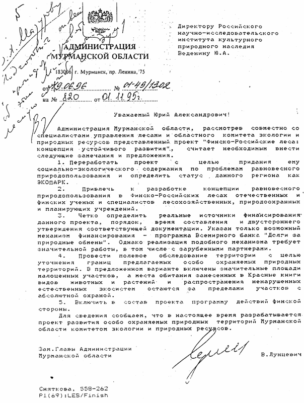| Начало | "Кутса" | "Терский берег"| "Хибины" | "Лапландский лес" | ПРИЛОЖЕНИЯПриложение 3. Письмо зам. Главы Администрации Мурманской области от 19.06.1995 г.