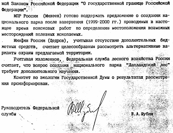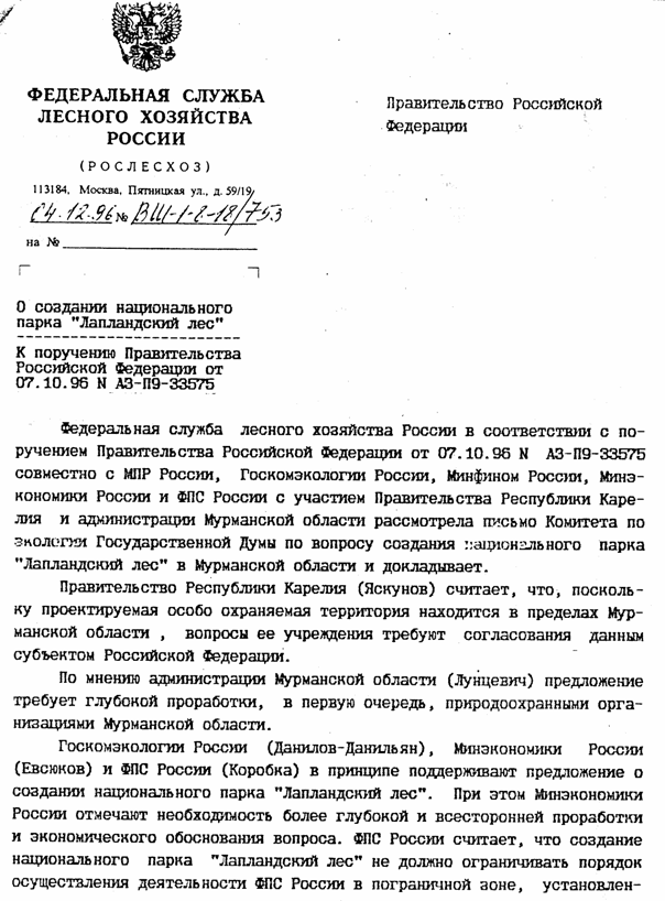 | Начало | "Кутса" | "Терский берег"| "Хибины" | "Лапландский лес" | ПРИЛОЖЕНИЯПриложение 5. Письмо руководителя Федеральной службы лесного хозяйства России от 04.12.1996 г.