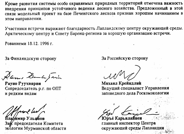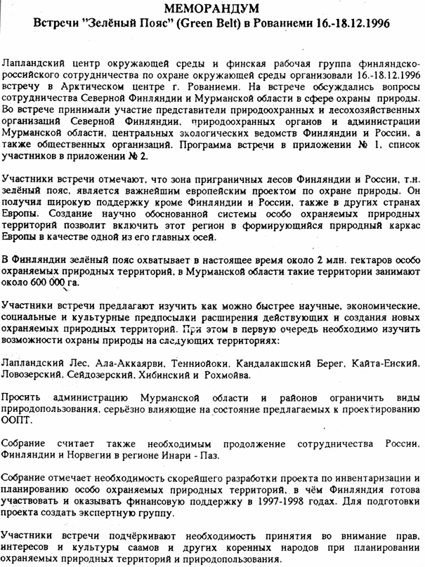 | Начало | "Кутса" | "Терский берег"| "Хибины" | "Лапландский лес" | ПРИЛОЖЕНИЯПриложение 8. Меморандум встречи "Зеленый пояс" в