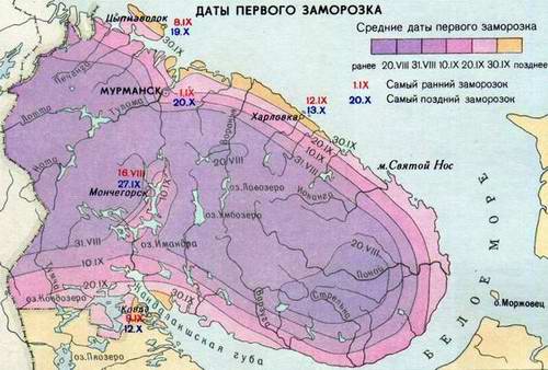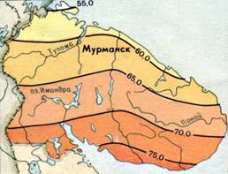 | Начало | "Кутса" | "Терский берег" | "Хибины" | "Лапландский лес" | 1. ОЦЕНКА ПРИРОДООХРАННОЙ И РЕКРЕАЦИОННОЙ ЦЕННОСТИ ТЕРРИТОРИИ, ПРИРОДНЫЕ УСЛОВИЯ1.3. КлиматКлимат Терского района, как и климат всей Мурманской области, благодаря своему географическому положению на границе между обширным материком, расположенным к югу, и акваторией Баренцева моря к северу от нее, теплее, чем характерно для данных широт. Терский район принадлежит целиком к одному климатическому району (5 район по климатическому районированию Б.А. Яковлева). Климат района сформировался под воздействием Белого моря и центральных районов Кольского полуострова, это придает ему черты, свойственные как морскому, так и континентальному климатам. Воздействие материка больше сказывается на побережье Кандалакшского залива, а Белого моря - на терское побережье. Поэтому при сравнительной однородности климата наблюдается лишь постепенные небольшие изменения в сторону повышения суровости с юга на север и с запада на восток. От Кандалакши до о. Сосновец средняя годовая температура понижается от +0,2° до -1,3°, средняя годовая относительная влажность увеличивается от 77 до 87% а повторяемость тумана повышается от 33 до 69 дней. Еще быстрее увеличивается суровость климата в указанном направлении в летнем сезоне. Осенью же условия погоды в районе сравнительно однородны. На территории описываемого района суммарная солнечная радиация за год изменяется с 70 на севере до 75 ккал/см2 на юге (рис. 1). Летом суммарная солнечная радиация для всей этой площади равна 37,5 ккал/см2, зимой она изменяется с севера на юг от 6 до 7 ккал/см2. Местоположение района на юге области в сочетании с высокой инсоляцией (рис. 2), однако, из-за охлаждающего влияния Белого моря, не обеспечивают наиболее благоприятного климата. Расположенные немного севернее, юго-западные районы области с континентальным климатом имеют менее суровые климатические условия (рис. 4, рис. 3).