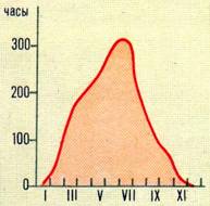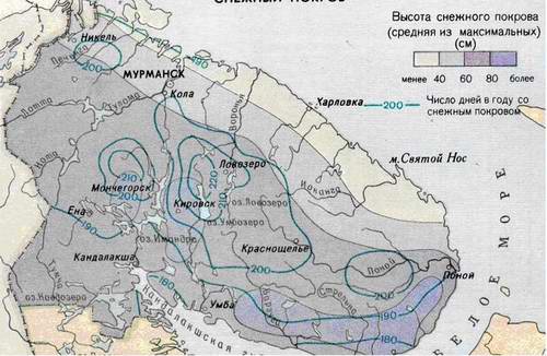 Рис. 4. Высота снежного покрова Среднее годовое количество осадков составляет 500-600 мм. Относительная влажность довольно высокая: 65-70% летом и 80-90% зимой. Район отличается большим числом дней с туманами, значительной облачностью - ясных дней в году около 8%. Важным климатическим фактором является сумма температур, равная в районе Варзуги 900 -1200 , тогда как к северу и востоку лежат территории с суммой температур ниже 700 -900 . Эти изменения отражаются и на растительном покрове: свойственные подобным климатическим условиям северотаежные равнинные леса к северо-востоку от описываемой территории становятся более разреженными. На прибрежной полосе также сказываются сильные холодные ветры, дующие весной и летом с северо-востока, и скопление льдов в горле Белого моря. В результате на побережье по мысам, занимая к востоку все более обширные площади, появляются фрагменты редкостойных лесов, лесотундровой и тундровой растительности.