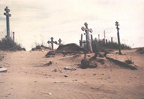 Рис. 18. Засыпаемое песками кладбище в с. Кузомень. Основное антропогенное воздействие на леса Терского берега в нашем веке оказали рубки главного пользования, проводимые Умбским леспромхозом. Рубки проводились, главным образом, в районе озер Индель, Ильма, Вялозеро и реки Паны, в том числе и вдоль побережья этих рек и озер, которые являются местом нерестилищ ценных промысловых рыб и в частности семги, что не могло не отразиться на их популяции. Позднее здесь были выделены нерестоохранные полосы, что предотвратило дальнейшую рубку леса. Как результат рубок главного пользования и недостаточного объема лесовосстановительных мероприятий в настоящее время на территории насчитывается несколько тыс. га вырубок. Кроме того, значительная площадь повреждена гарями разных лет, которые возникли в основном от неосторожного обращения с огнем рабочих леспромхоза, рыбаков, охотников и туристов. Это явилось также следствием недостатков в охране лесов от пожаров. Более 3-х лет назад рубки главного пользования лесом были прекращены, и сейчас главная задача - это лесовосстановление на вырубках и гарях. Резко отрицательное влияние на состояние обитания и размножения рыбы и окружающую природу оказали сооруженные ранее на проточных водоемах плотины, предназначенные для нужд лесосплава. В оз. Индель плотина на одноименной реке привела после подъема уровня воды к гибели прибрежной высшей растительности, повлекла за собой ухудшение условий размножения плотвы, щуки и др. рыб. Она же перекрыла доступ семги в реку Роуксу. Особенно тяжелые последствия вызвало возведение плотины на реке Вяла на берегу оз. Вялозеро, превратившим эту реку в канал с высокими скоростями воды и совершенно разрушенными нерестовыми стациями. Это привело, практически, к исчезновению семги в реке, которая сейчас в ничтожном количестве проникает в мелкие притоки. Ликвидация плотин на р.р. Индель и Вяла позволит восстановить миграционные пути проходных лососей, улучшит условия их обитания и естественного размножения. В настоящее время на дне вышеуказанных озер имеется значительный объем топляка. В 1992 году начаты работы по его извлечению, но они идут медленно и не регулярно.