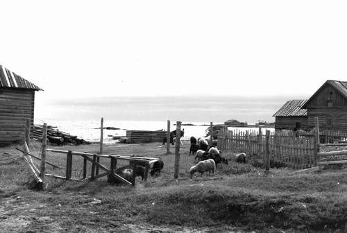 Рис. 21. Село Чаваньга. Овцы пасуться на приморском лугу Количество скота зависело от наличия лугов в окрестностях селения. Каменистые и болотистые земли часто не позволяли иметь много скота. Заготовкой сена занимались обычно в августе. Траву косили в лесах "горбушей" - косой наподобие большого серпа. С морских побережий сено свозили в селения на широкобортных лодках - карбасах. Кроме сена в корм скоту давали ягель и морские водоросли. Ягель дергали после покоса, складывали в кучи, втыкали в них палки с меткой, а после заморозков стаскивали в копны и на оленях по первопутку свозили к домам. Летом скот пасся по морским побережьям, на островах и в долинах рек. Во время морского отлива коровы спешили на обнажившееся дно, где находили водоросли - капусту, туру, "горох". Обследование 1896 года показало следующую картину. Умба: сенокосы порядочные, на 87 дворов имеется до 200 голов скота; Кузомень (180 дворов): "Есть сенокосы при реке Варзуге, но весьма незначительные; пастбища удалены так, что скоту за маленькой травкой приходится пробираться по песку 6-7 верст... коров и овец всего до 300 голов". В лучшем положении селения западной части Терского берега. Кандалакша: "Сенокосы столь хороши, что излишек их сдают в аренду княжегубским мужикам"; Кашкаранцы: "Хорошие сенокосы дают возможность крестьянам содержать по три коровы на двор". По учету 1889 года на Терском берегу насчитывалось у крестьян крупного рогатого скота 805 голов, овец - 1 777 голов. Одна корова приходилась в среднем на 5,4 жителя, овца - на 2,4 жителя. В начале заселения Терского берега русские крестьяне пытались использовать лошадей, но скоро убедились в их малопригодности в условиях Заполярья. Зимою, по бездорожью, лошадь вязла в сугробах, тогда как дешевый и малосильный, по сравнению с лошадью, олень легко вез одного седока, мог доставлять в селения не очень большие грузы (дрова, сало морских зверей и т.п.). По учету 1785 тетринскне крестьяне держали 50 оленей, жители Кандалакши - 100. В 1871 году русские крестьяне на Терском берегу имели уже 2 865 оленей. Русские крестьяне огораживали оленьи пастбища протяженными изгородями; на зиму для подкормки животных заготовляли некоторое количество ягеля; рабочих оленей держали в домашнем загоне. Кузоменские богачи Заборщиковы пасли свои стада с помощью наемных пастухов на ягельниках в Понойской волости (в том числе, видимо, на Терских и Дальних кейвах), выращивали оленей на убой для продажи шкур и мяса. В советское время оленеводство сначала развивалось даже активнее, однако потом исчезло.