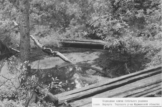 Рис. 23. Село Чаваньга с. Тетрино возникло как выселок с. Варзуга в 1660 г. В XVII в. называлось Тетринская слободка. с. Чапома. Расположено на правом берегу р. Чапома, при впадении ее в Белое море. Известна с XVIII в. с. Пялица. Пялицкая волость (одно селение) впервые упоминается в документах 1782 г. В разделе "Традиционное и историческое природопользование" содержится указание на яркое проявление поморской экологической культуры - почитание святых лечебных источников. Материальными памятниками этому явлению являются сами родники. Практически во всех населенных пунктах были так называемые святые источники, вода которых использовалась в лечебных и профилактических целях. Но наиболее известен родник "Собачий ручей" (рис. 24) под Варзугой.