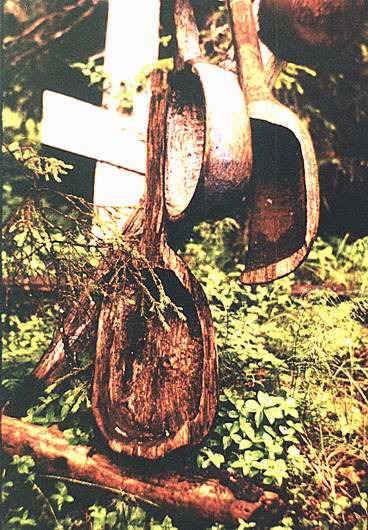 Рис. 25. Деревянные ковши для обливаний на роднике "Собачий ручей" Своеобразным памятником истории освоения подземных богатств Кольского полуострова могут служить старинные разработки аметиста на территории памятника природы "Аметисты мыса Корабль". Памятник расположен в 15 км к востоку от д. Кашкаранцы. В окварцованных плитчатых красноцветных песчаниках отмечается минерализованная брекчия, обломки которой сцементированы кварцем. Стенки многочисленных пустот инкрустированы аметистом. Этот драгоценный материал добывался в течение многих десятилетий, когда началась его добыча, сейчас точно неизвестно. При обследовании территории памятника были найдены очень старые выработки, устная молва относит их к Екатерининским временам. С 1986 г. промышленная разработка аметиста прекратилась по экономическим соображениям. Древние разработки представляют исторический интерес.